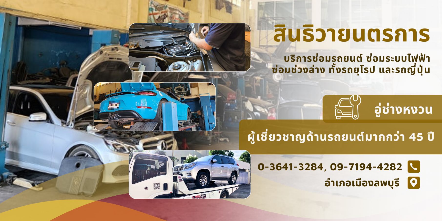 ได้เปิดบริการ อู่ซ่อมรถ สินธิวายนตรการ มานานกว่า 27 ปี เป็นที่รู้จักของชาวบ้านในชื่อ "อู่ช่างหงวน" อู่ซ่อมรถที่ชาวลพบุรีต่างไว้วางใจ เจ้าของที่มีประสบการณ์ด้านยานยนต์กว่า 42 ปี เราพร้อมช่วยเหลือเมื่อยามรถของท่านมีปัญหา ทำให้มั่นใจได้ในคุณภาพงานซ่อม บริการครอบคลุมการซ่อมเครื่องยนต์ ระบบกันสะเทือน คลัตช์ เกียร์ ระบบทำความเย็น ระบบไฟฟ้า และเชื้อเพลิง รับซ่อมรถนอกทุกชนิด มีเครื่องมือและอุปกรณ์ที่ทันสมัยกับเทคโนโลยีของรถยนต์รุ่นใหม่ ๆ ไม่ว่าจะเป็นรถยี่ห้อ